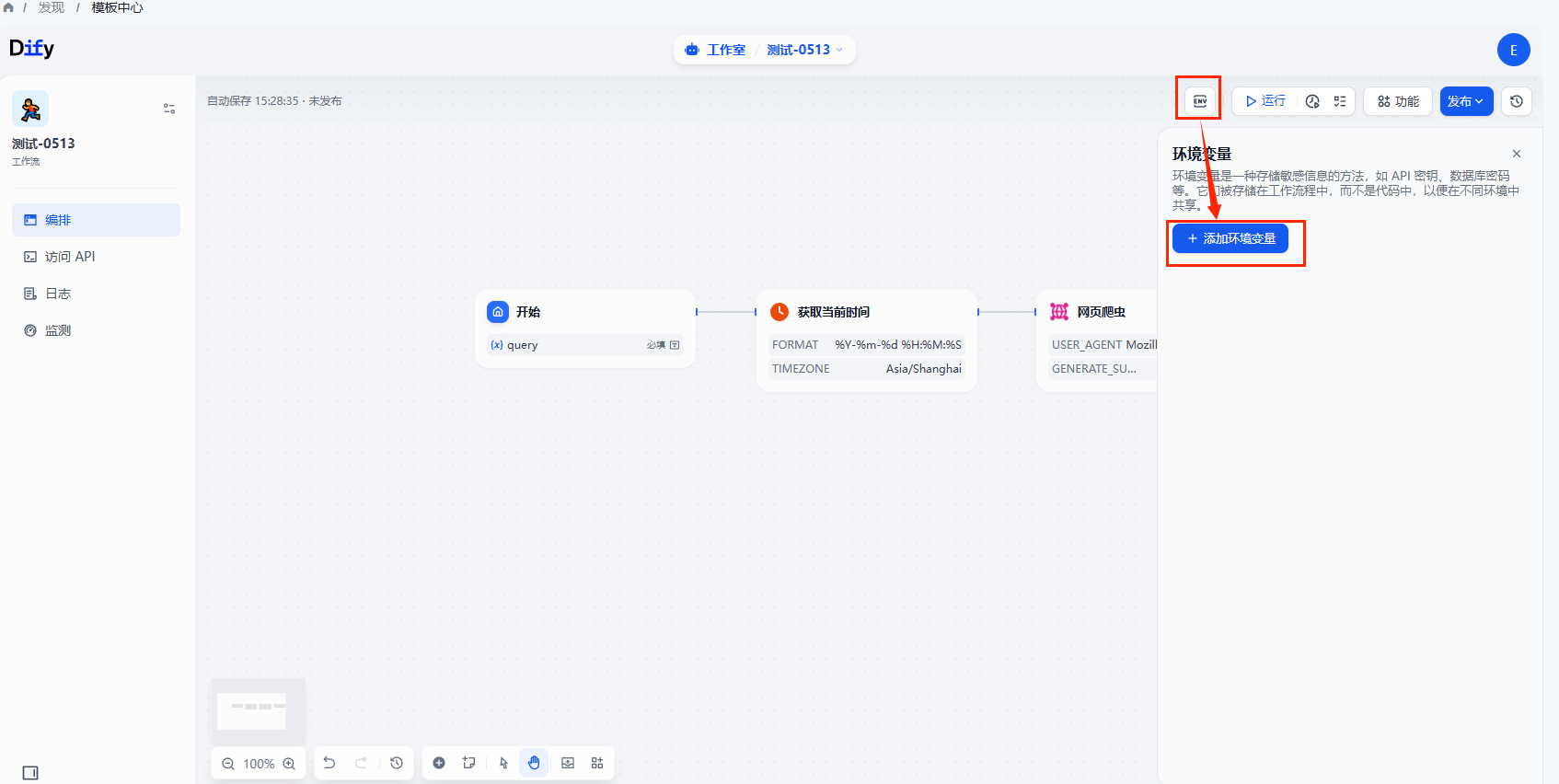 环境变量用于保护工作流内所涉及的敏感信息,例如运行工作流时所涉及的 API 密钥、数据库密码等。它们被存储在工作流程中,而不是代码中,以便在不同环境中共享。