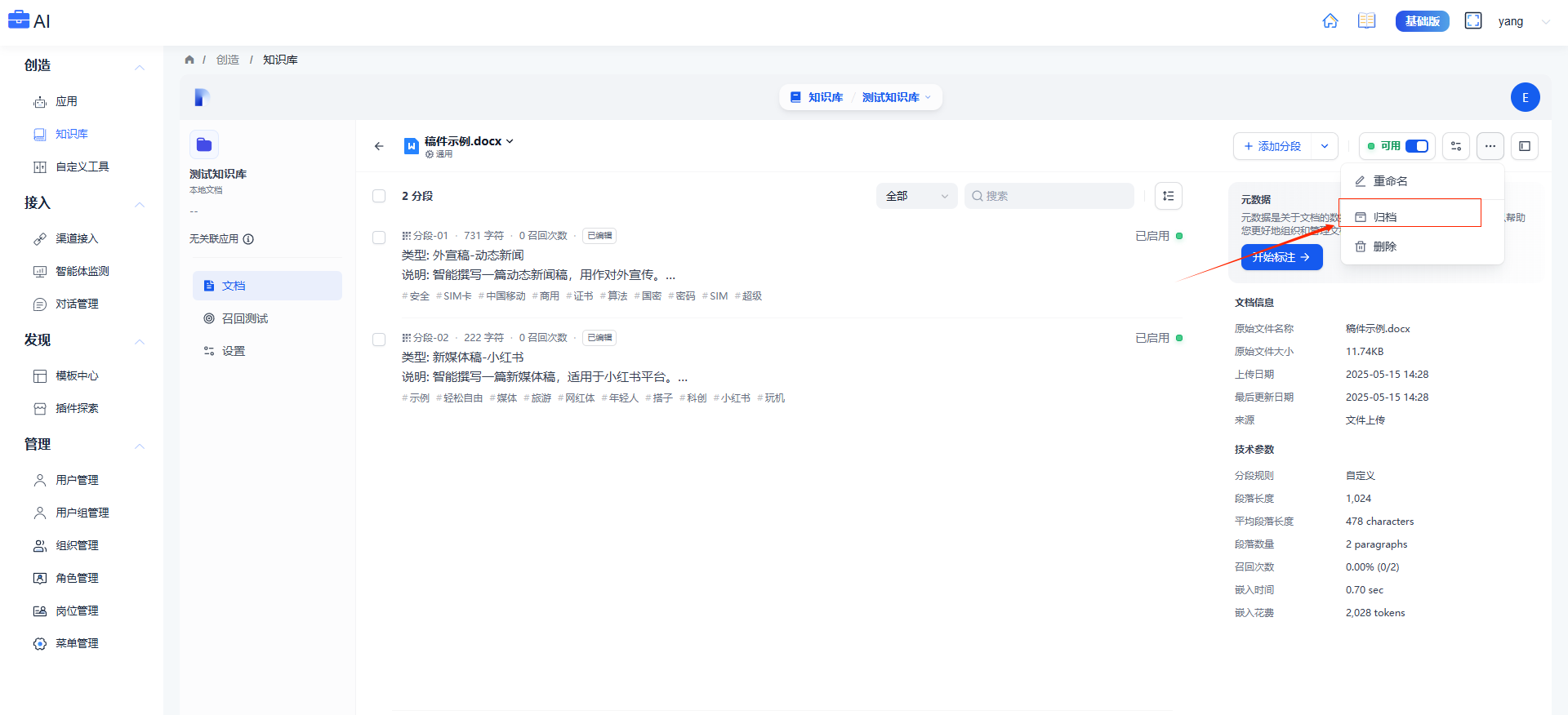 - 归档:对于一些不再使用的旧文档数据,如果不想删除可以将其归档。归档后的数据就只能查看或删除,无法重新编辑。你可以在知识库文档列表,点击归档按钮;或在文档详情页内进行归档。归档操作支持撤销。