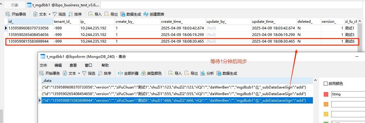 (4)等待触发相对时间1分钟后,mysql同步数据