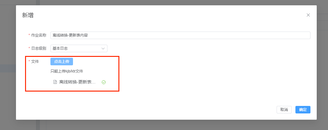 点击右上角新增 -> 填写作业名称 -> 选择日志级别 -> 点击上传 -> 点击确定